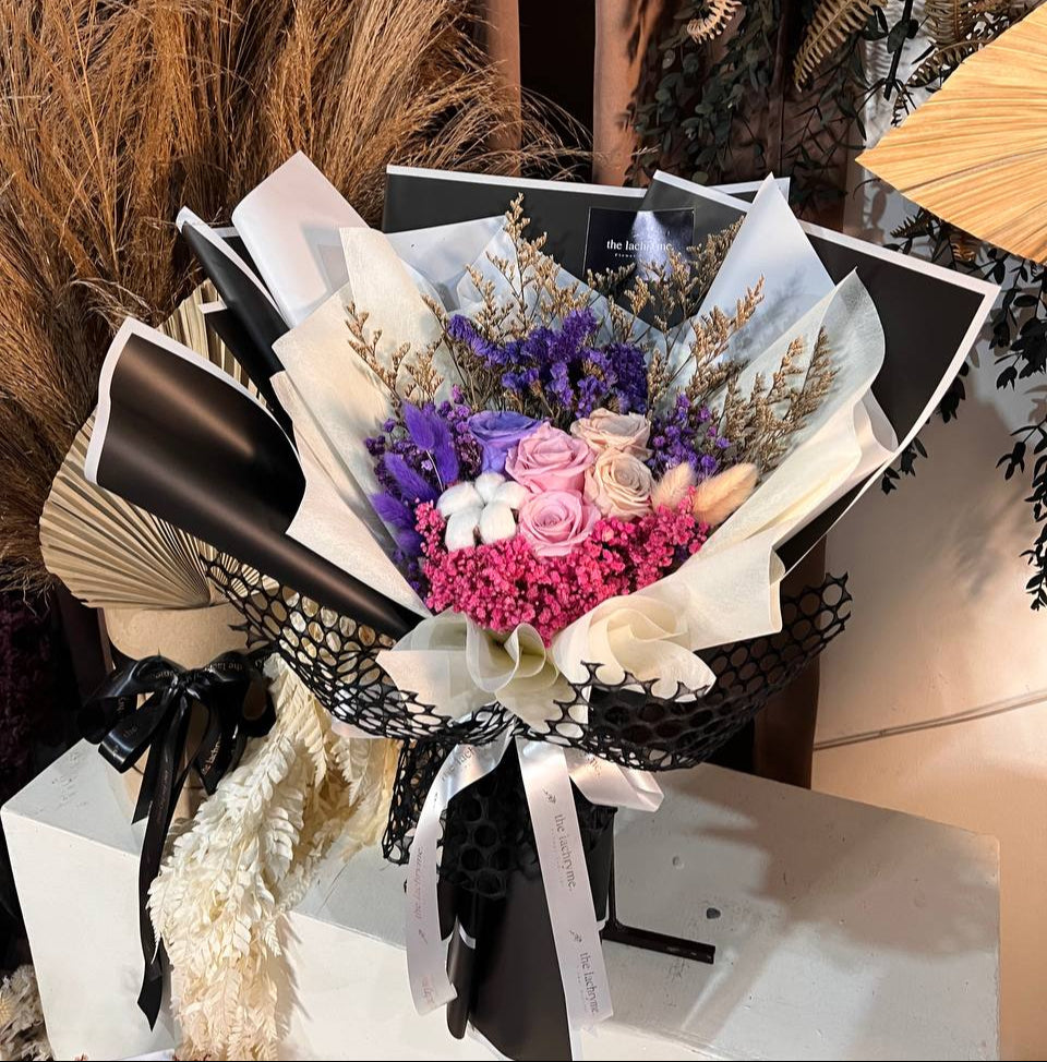 Composed of Six (5) preserved Ecuadorian roses, (1) cotton flower, and dried flower fillers for a classy and deluxe bouquet.