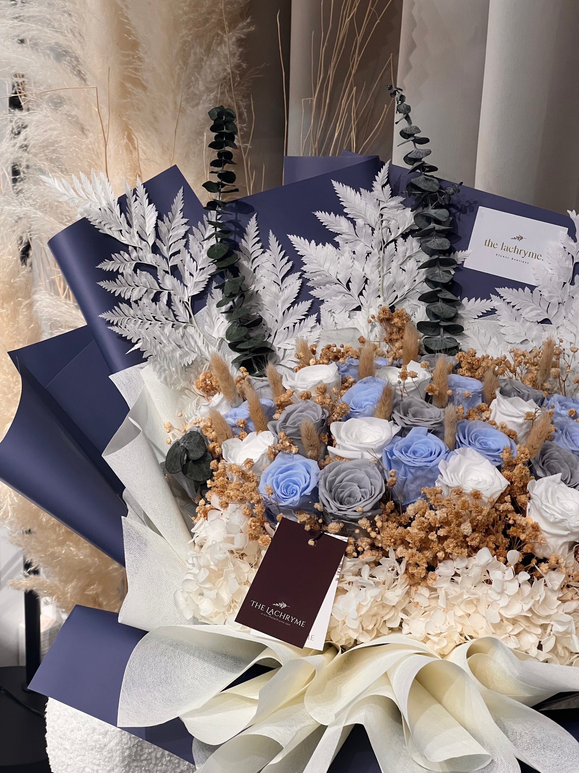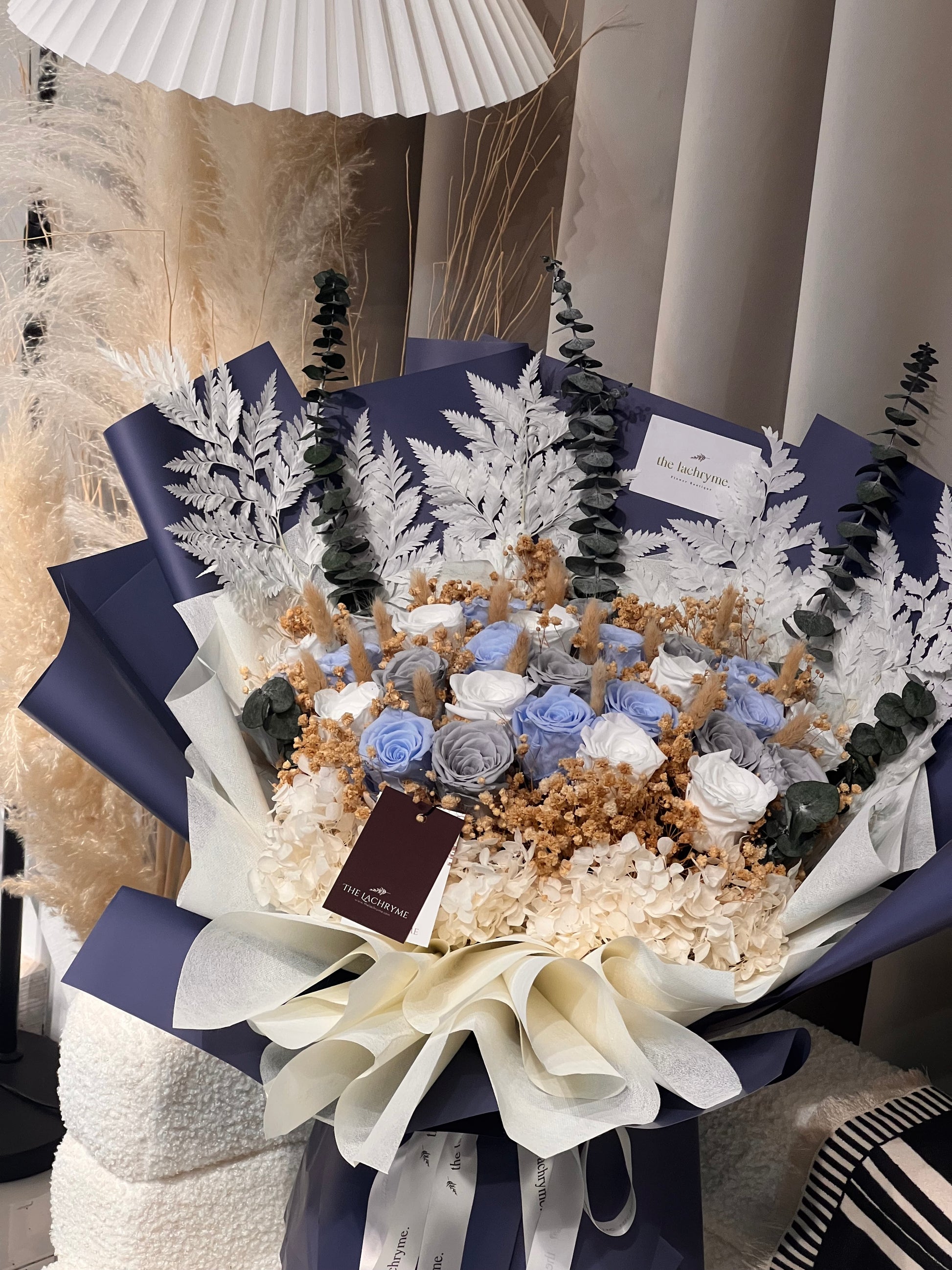 Inspired by the serene beauty of moonlit evenings and the purity of everlasting love, this bouquet features 27 preserved roses in an elegant palette of soft blues and crisp whites.
