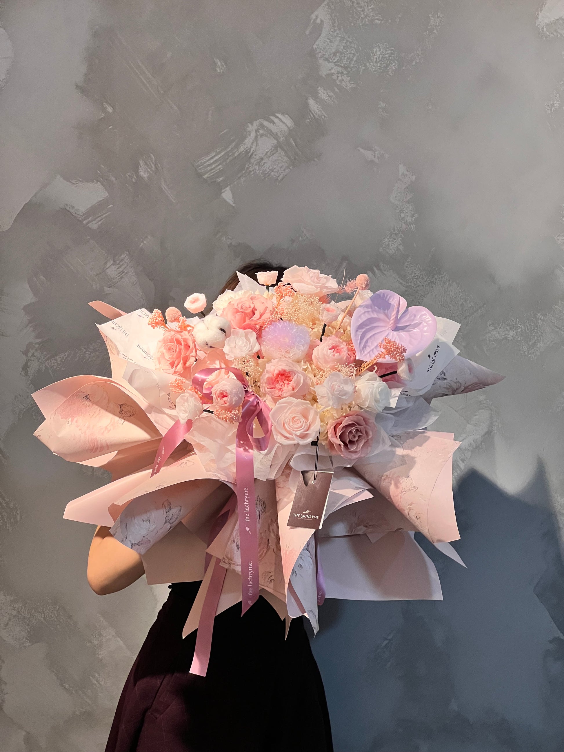 A bespoke floral creation for Ms. Gehlee Dangca (UNIS) — where timeless grace meets delicate allure. This classic round bouquet features rich pink preserved roses, peonies, dahlias, and anthuriums, each bloom capturing enduring beauty and refined charm.