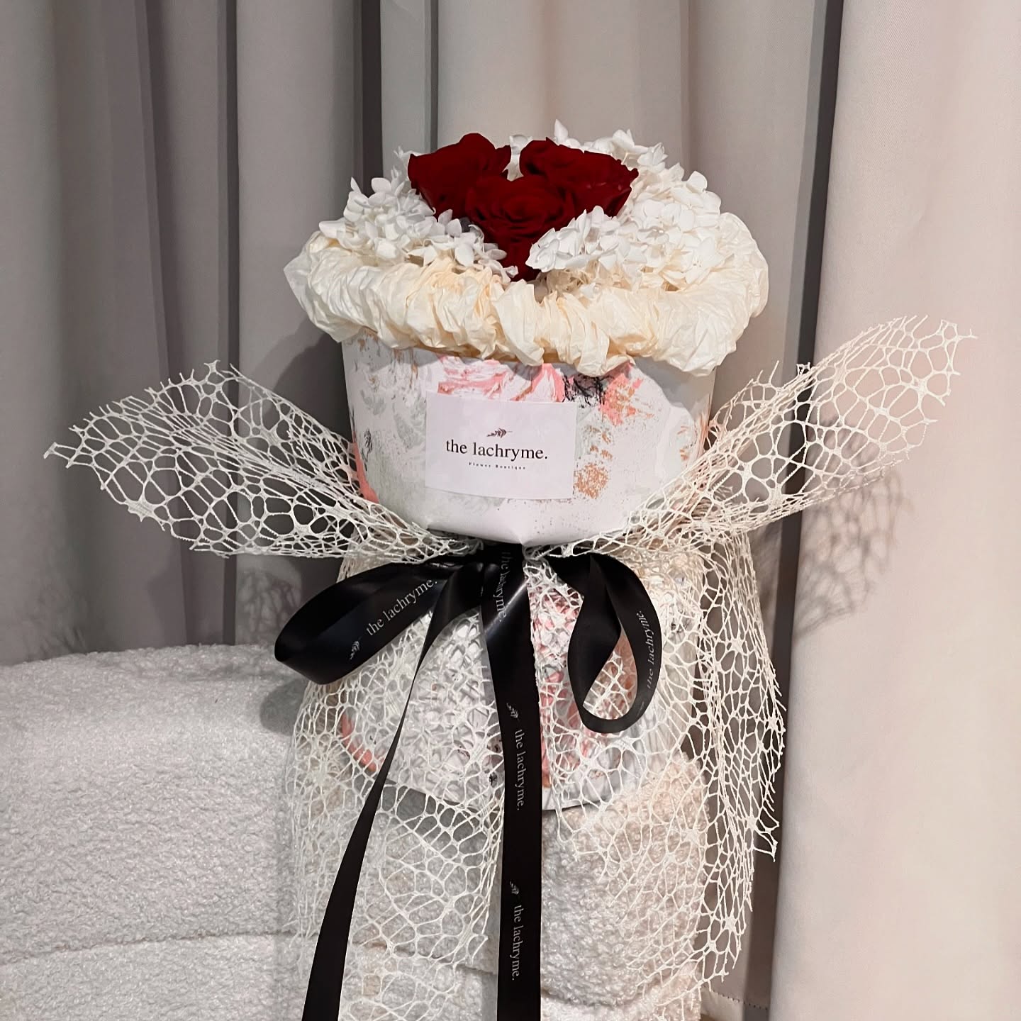 A classic and elegant round bouquet composed of 3 preserved Ecuadorian roses and dried flower fillers inspired by the European 1800s style - a timeless million roses.