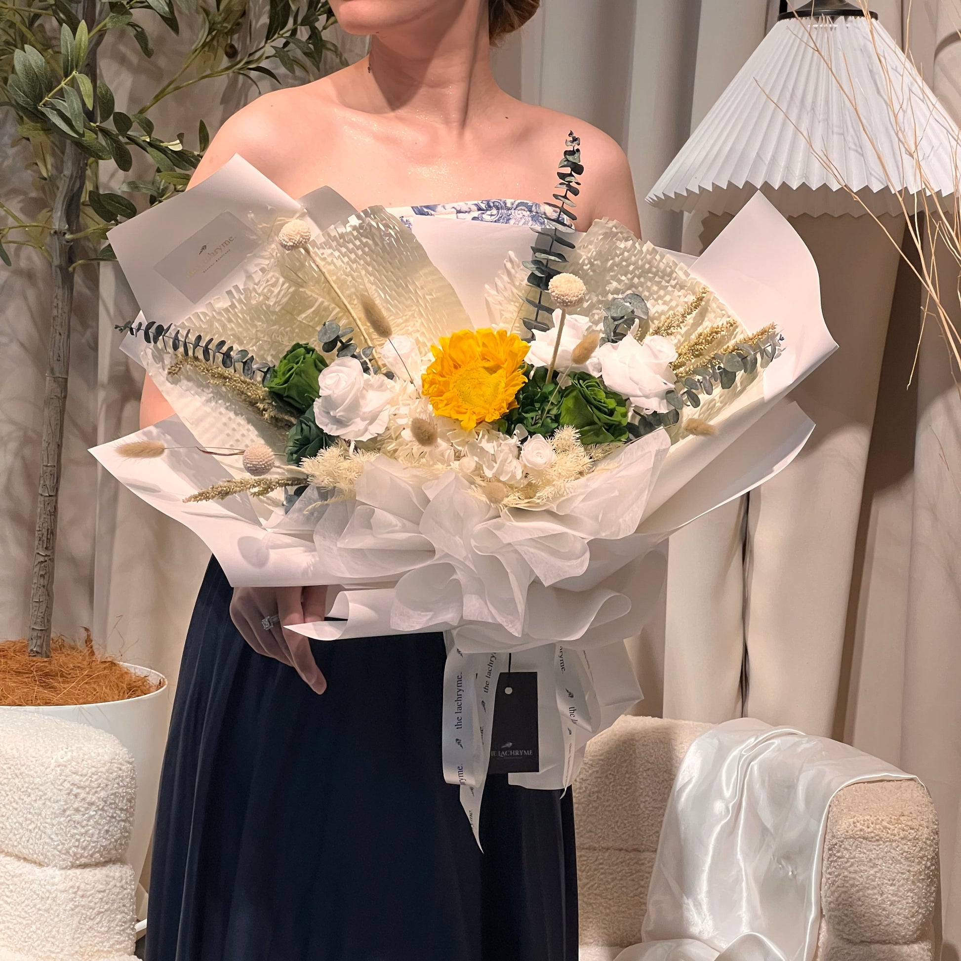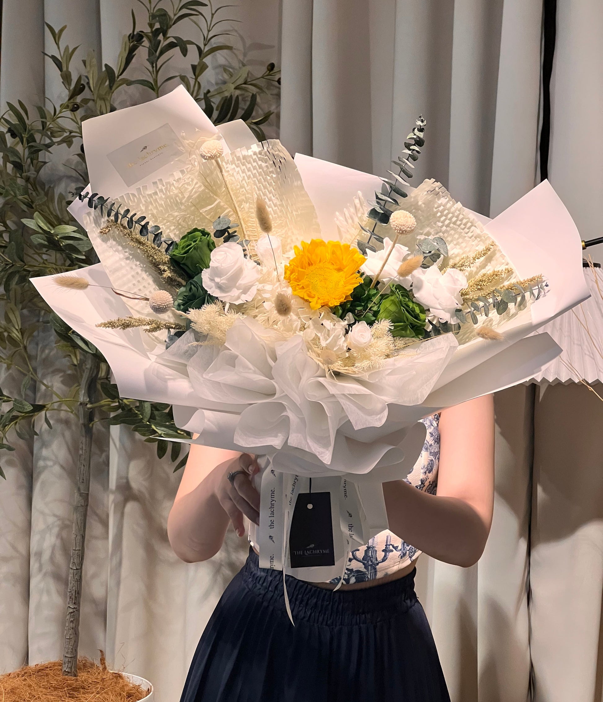 Lumière de Sunflower — a radiant preserved sunflower, paired with timeless preserved roses and delicate dried fillers. Sunflowers symbolize strength, optimism, and unwavering loyalty, while roses embody love and grace. Together, they create a bouquet of joy, resilience, and lasting beauty — crafted to endure through every season.