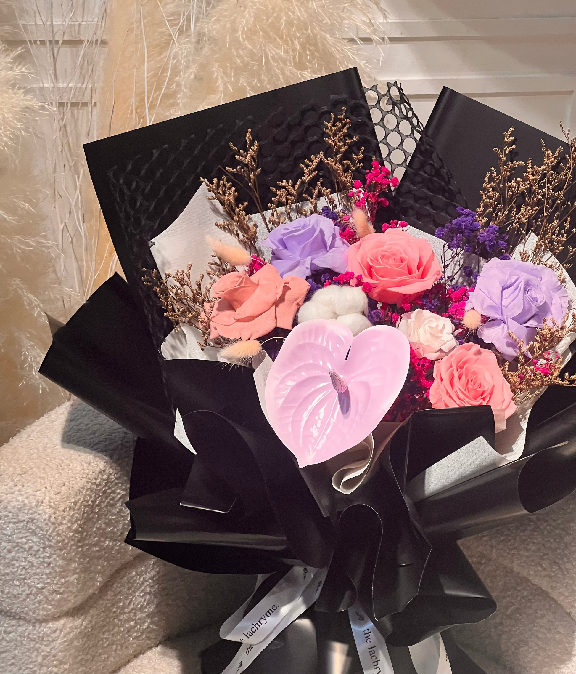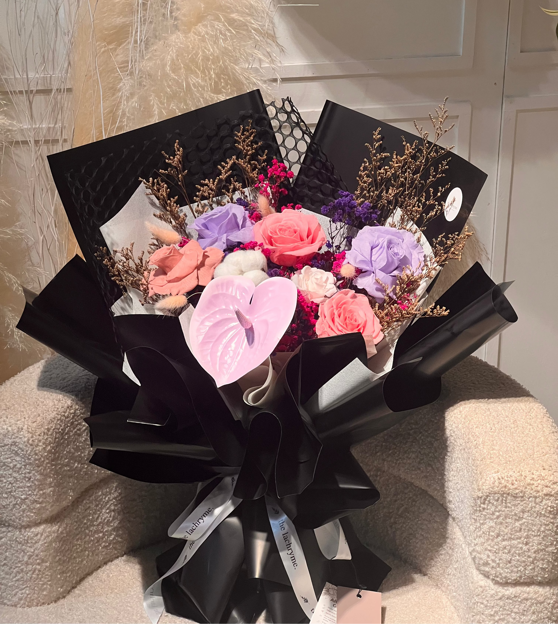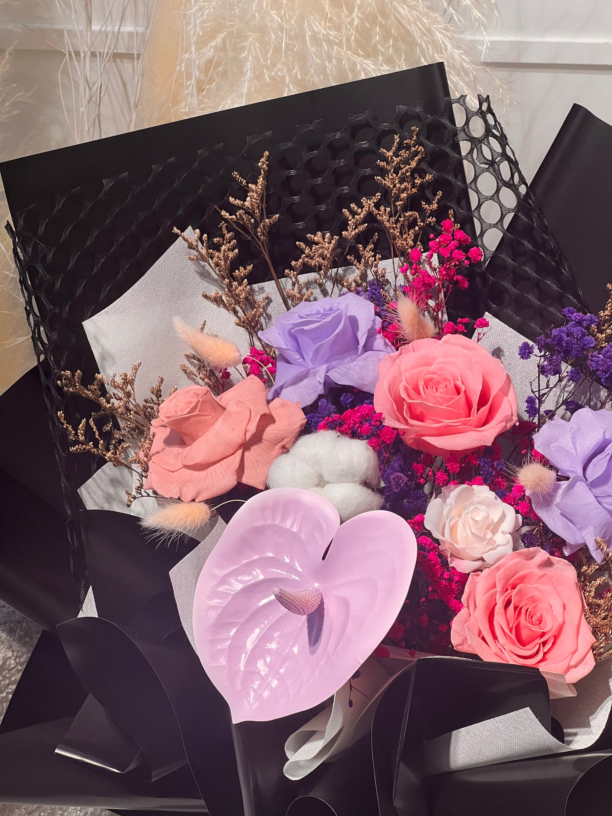 Introducing the K-Style Bloom Bouquet, exquisitely composed of 6 preserved roses, paired with a soft cotton flower and a sculptural anthurium. Accented with delicate dried florals and finished in refined, elegant wrapping, each bouquet embodies a quiet, understated luxury.