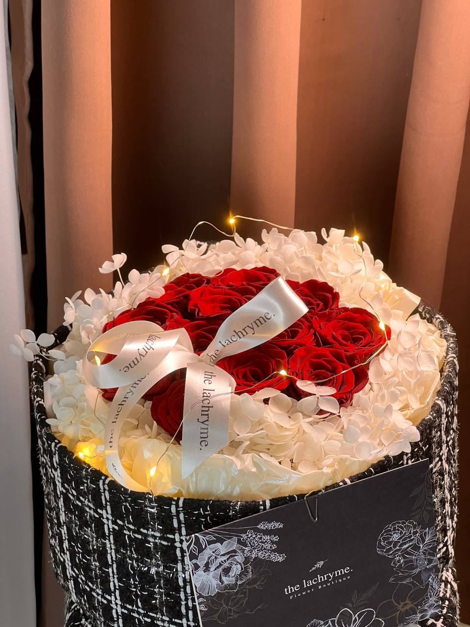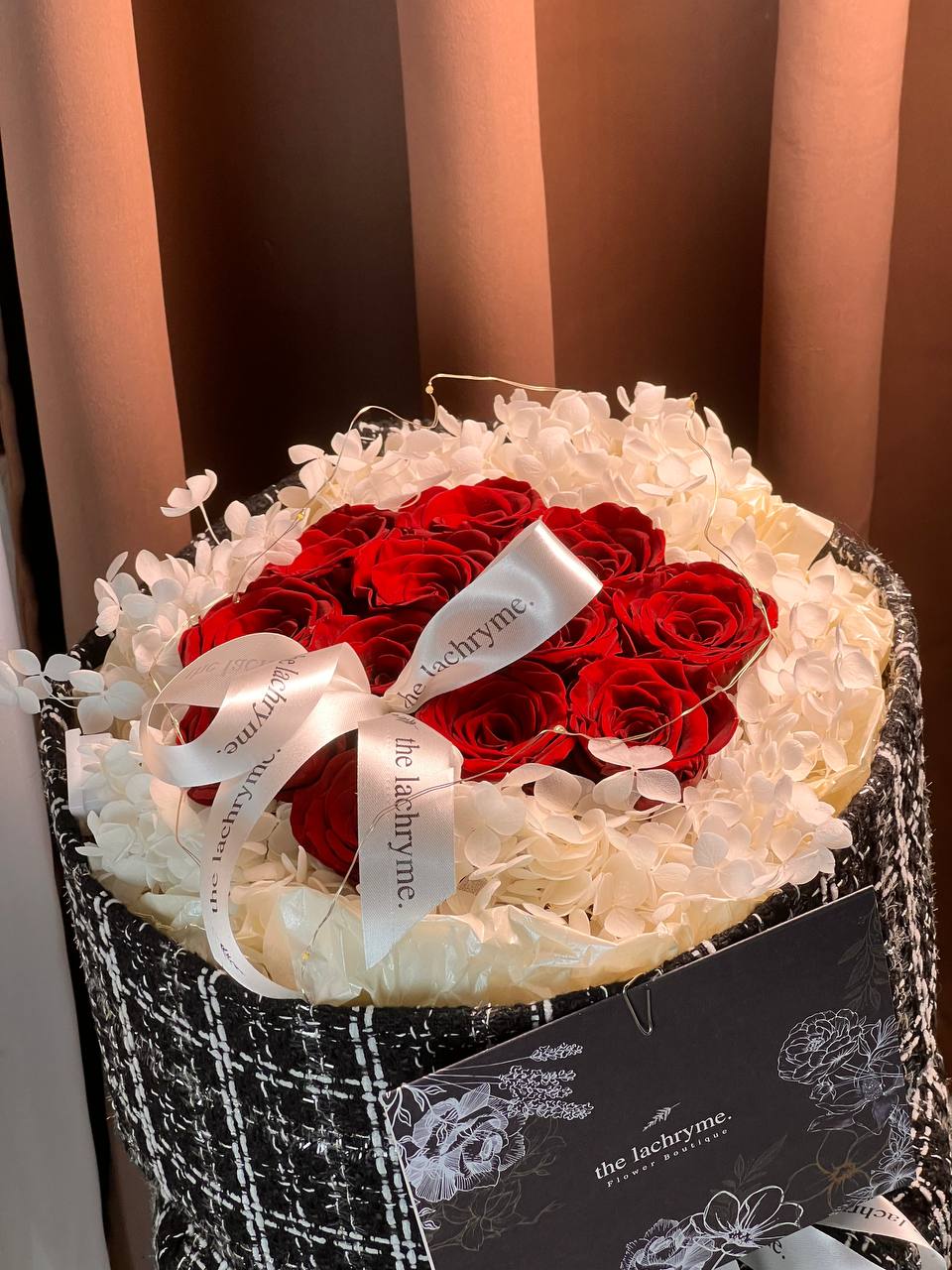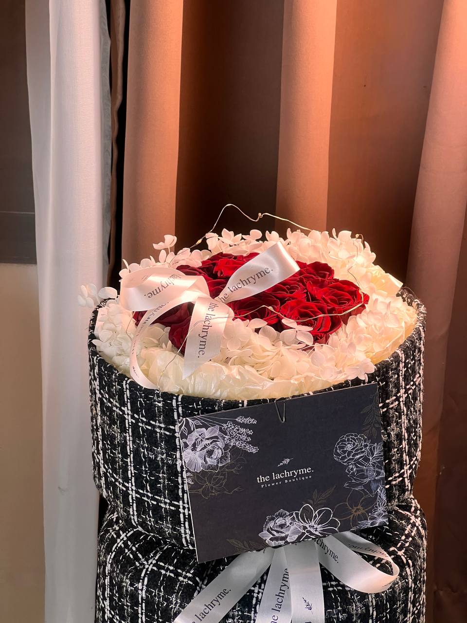A classic and elegant round bouquet composed of 12 preserved Ecuadorian roses and dried flower fillers inspired by the European 1800s style - a timeless million roses.