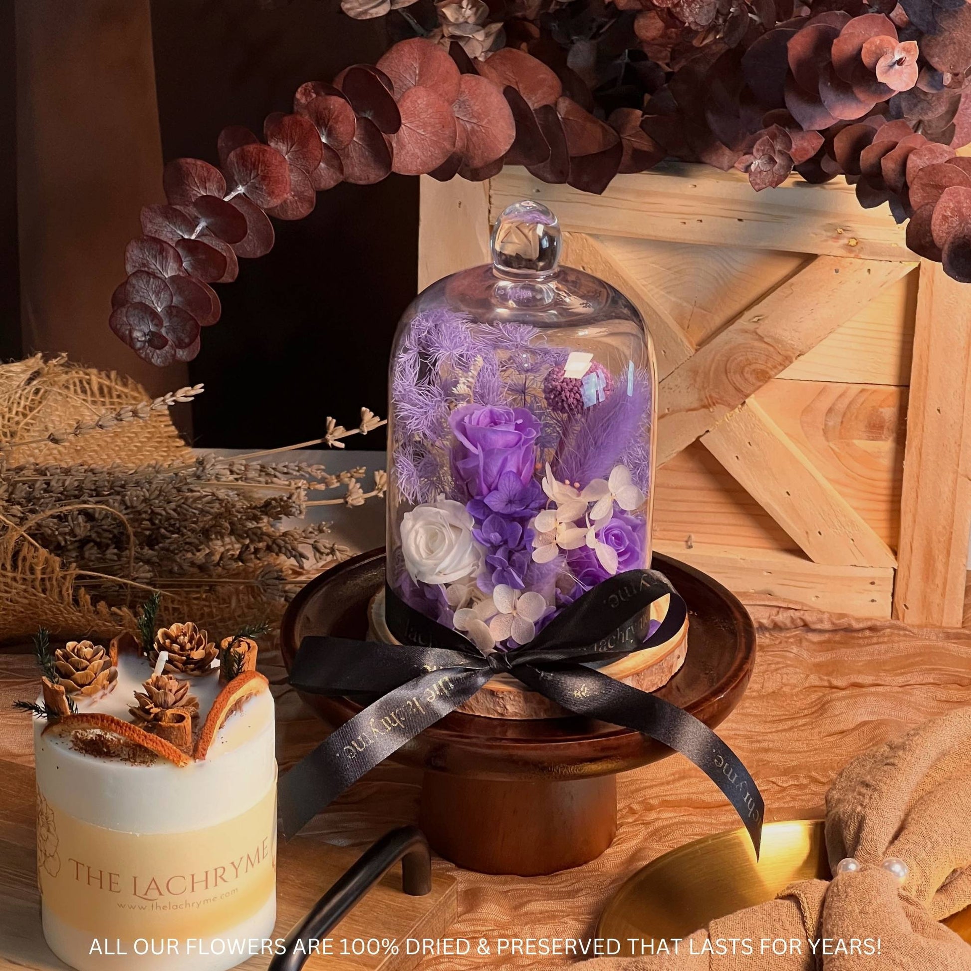 An exquisite arrangement inside a Dome composed of an Eternal Preserved Rose, Hydrangeas, Bunny Tail, Retro, and other dried flowers.